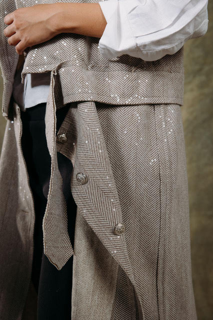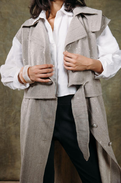 Crafted from durable, textured wool, this casual long vest adds warmth and a relaxed vibe to your everyday outfits. Its extended length makes it perfect for layering over tops or dresses, giving you a cozy yet chic look for cooler days.