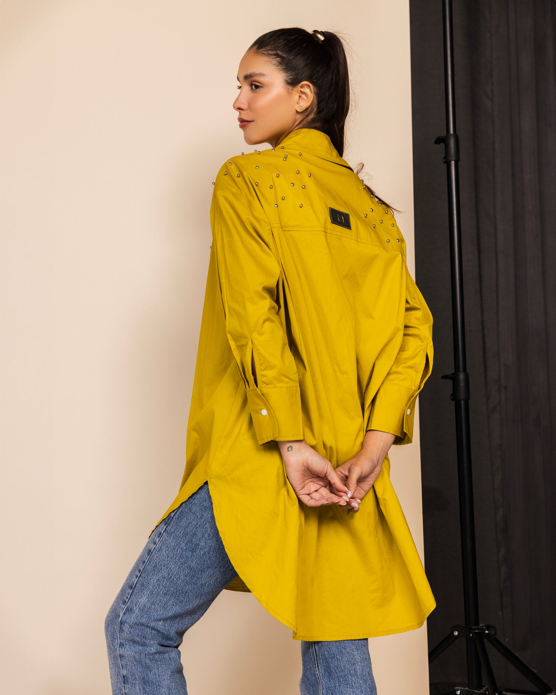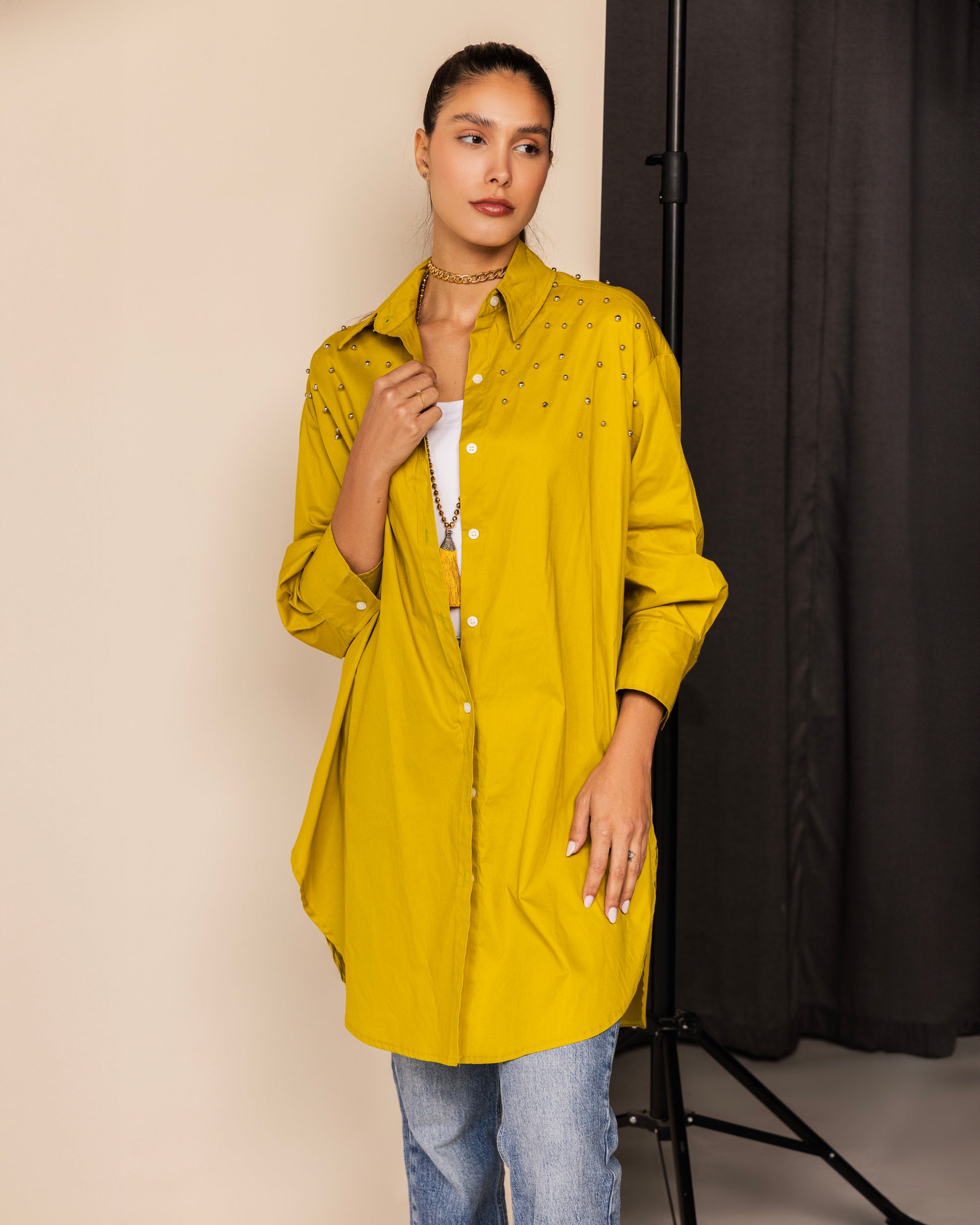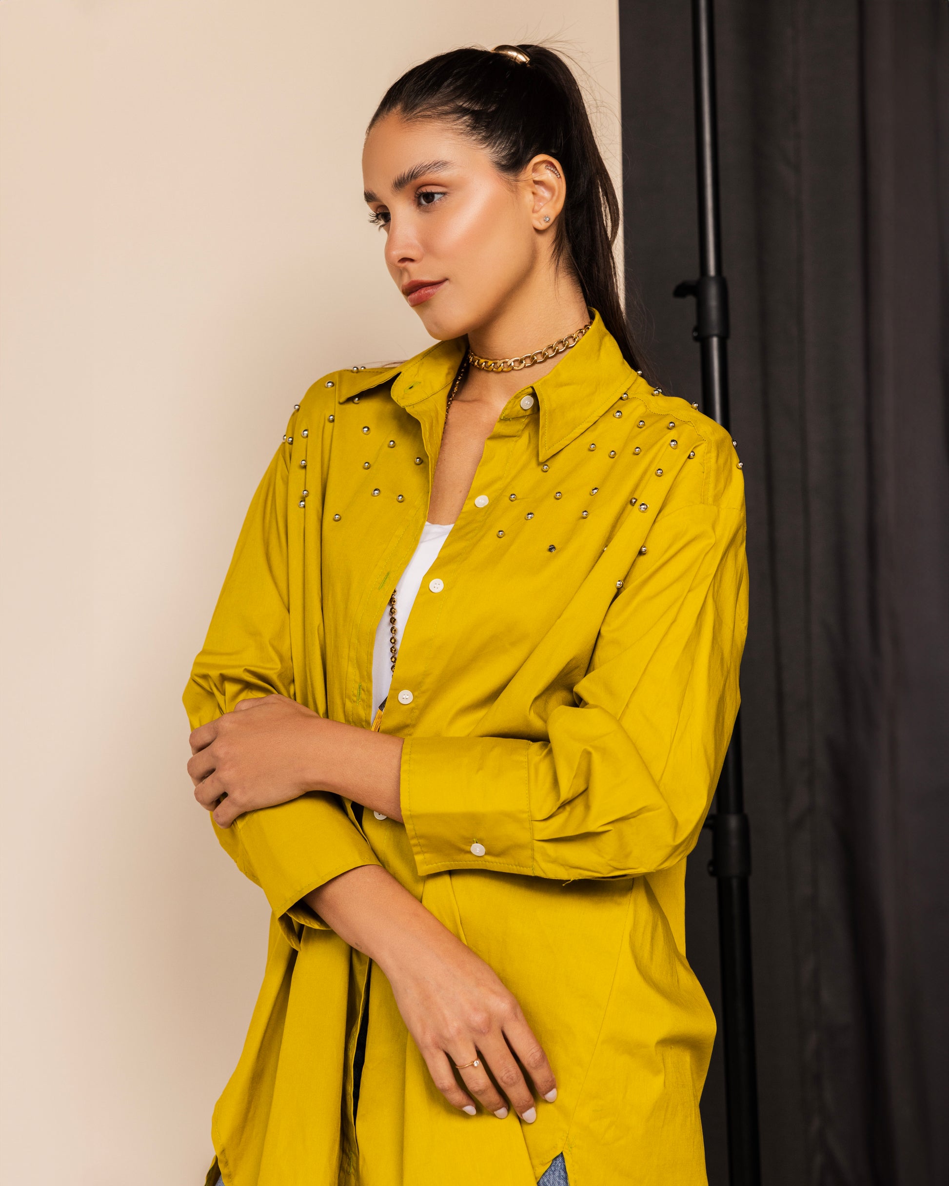 Crafted from premium fabric for a soft, breathable feel, it drapes effortlessly, making it a versatile staple for any wardrobe. Whether dressed up with tailored trousers or styled casually with denim, the [luxe Studs Chemise ] adds a touch of understated glamour to any look.
