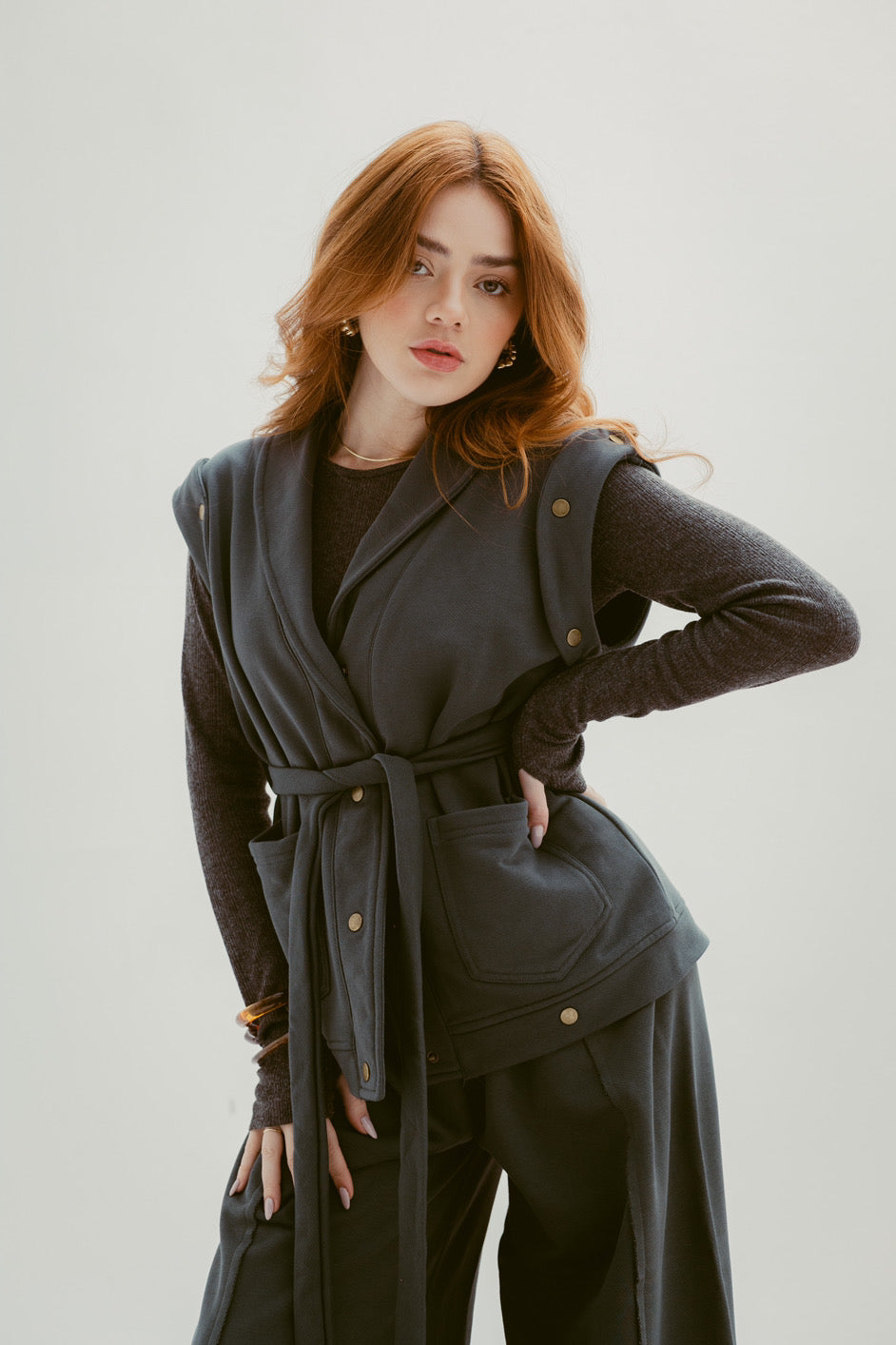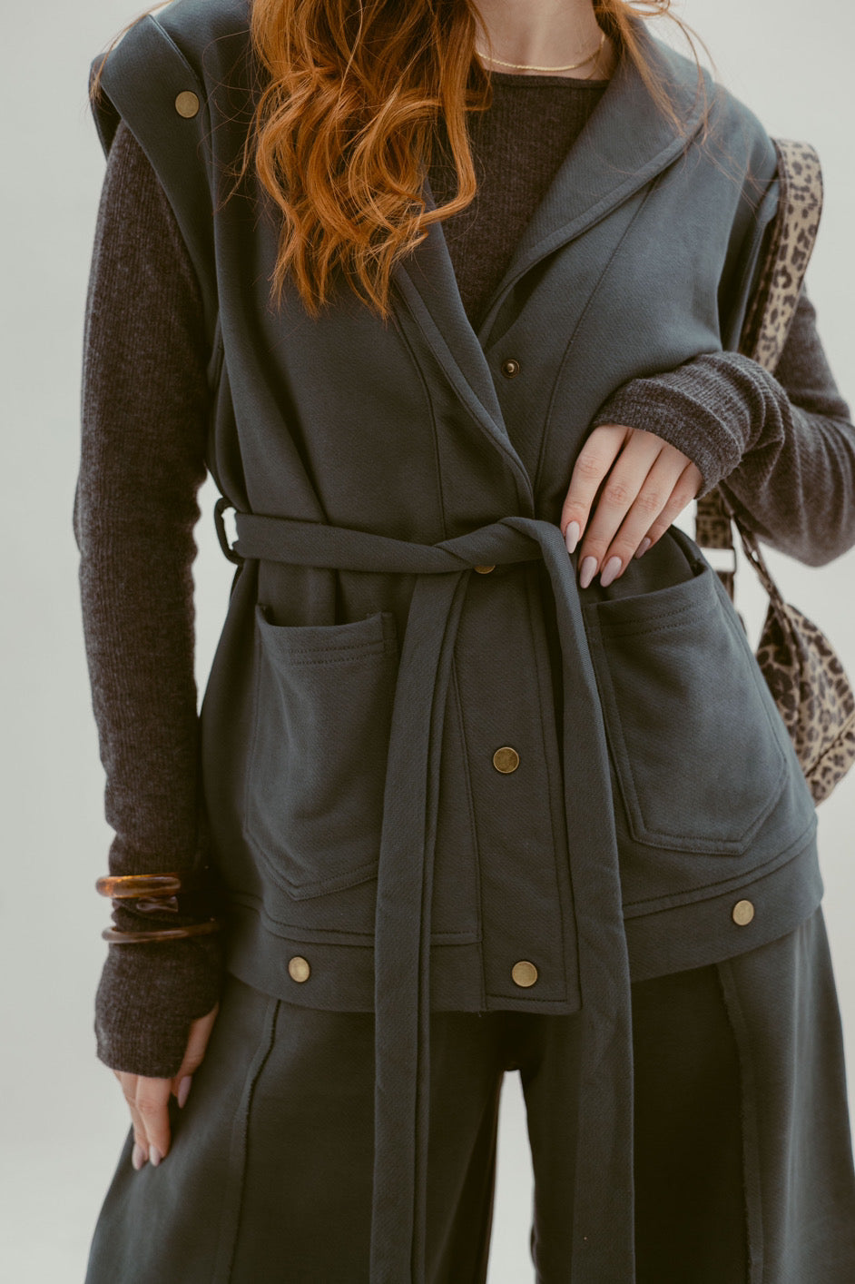 The vest design adds a stylish layering feel, while the subtle stud detailing brings just the right amount of attitude to a clean, minimal look.