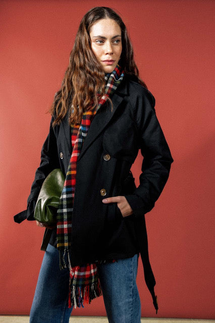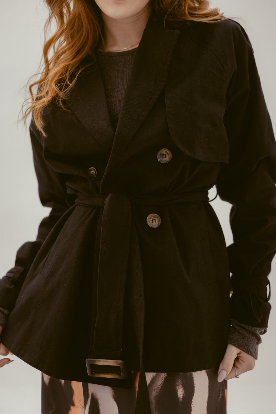 Designed in a sleek, modern silhouette, this short trench jacket combines elegance with everyday versatility. Its tailored fit and timeless black shade make it perfect for layering over casual or chic outfits, giving you a polished look effortlessly.